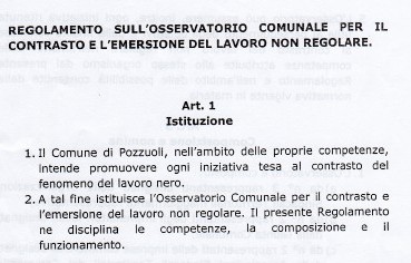 “Questo regolamento –ha sottolineato il consigliere Tito Fenocchio- rappresenta un punto di partenza importante per combattere un elemento di grave disgregazione sociale. Basti pensare che, secondo gli ultimi dati Istat in nostro possesso, è disoccupato il 60% dei giovani puteolani di età compresa tra i 18 ed i 26 anni, percentuale che sale all’80% per le donne e sfiora il 90% in quartieri come Monterusciello, Toiano e Licola. Praticamente, oggi la massima aspirazione dei nostri giovani è diventata quella di trovare un lavoro irregolare”.